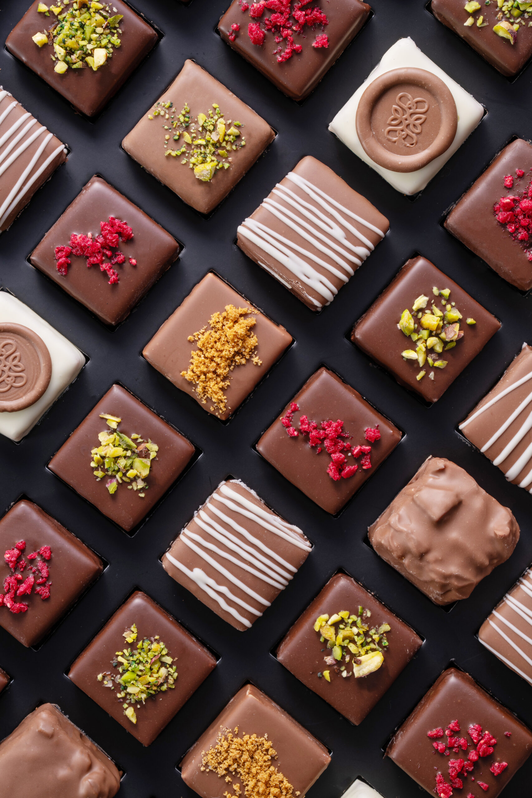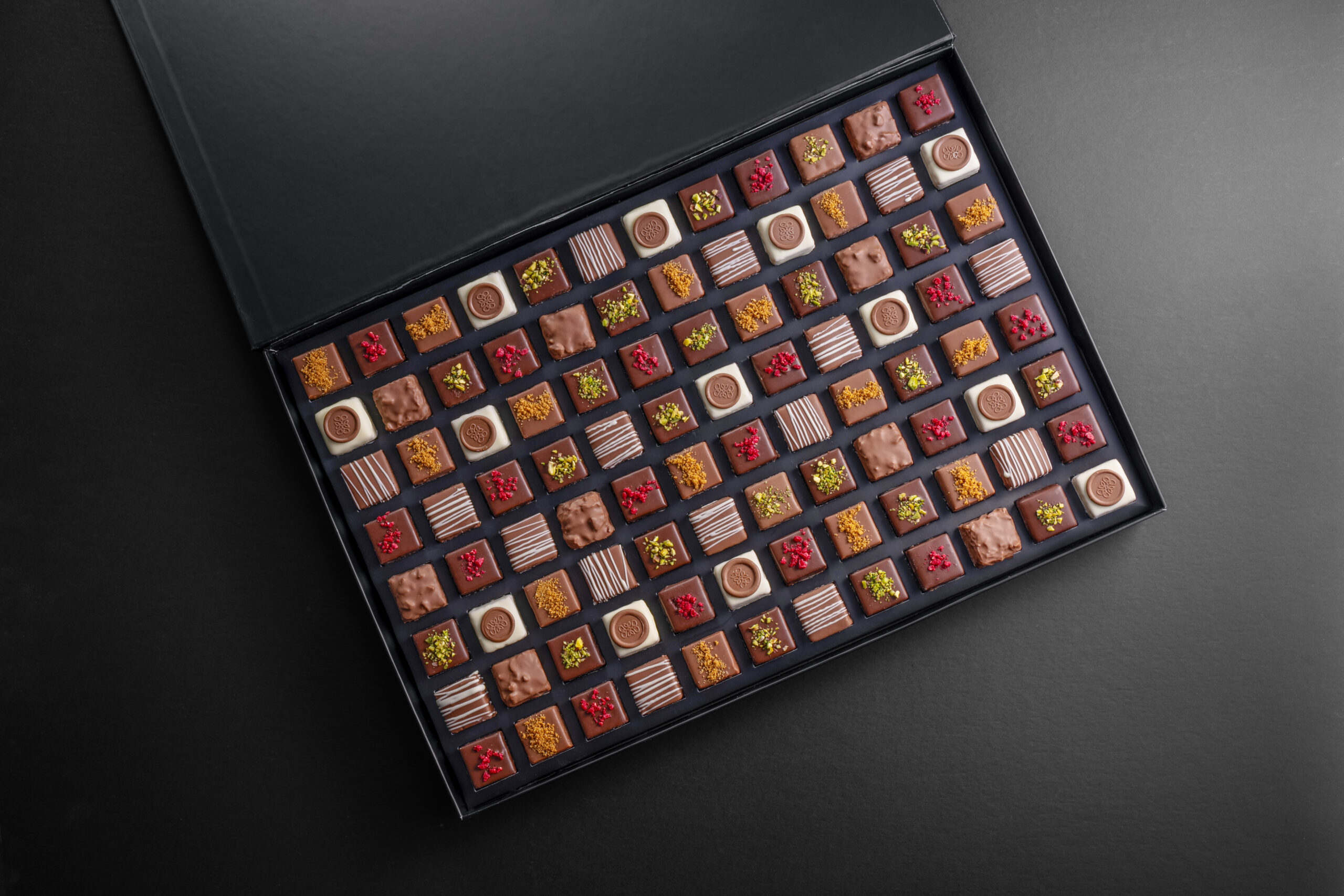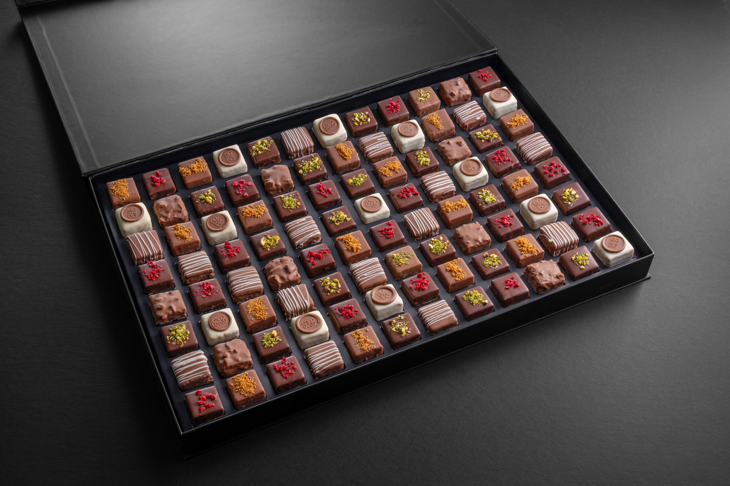 A grand assortment of layered chocolates, perfect for gifting or sharing at special occasions.